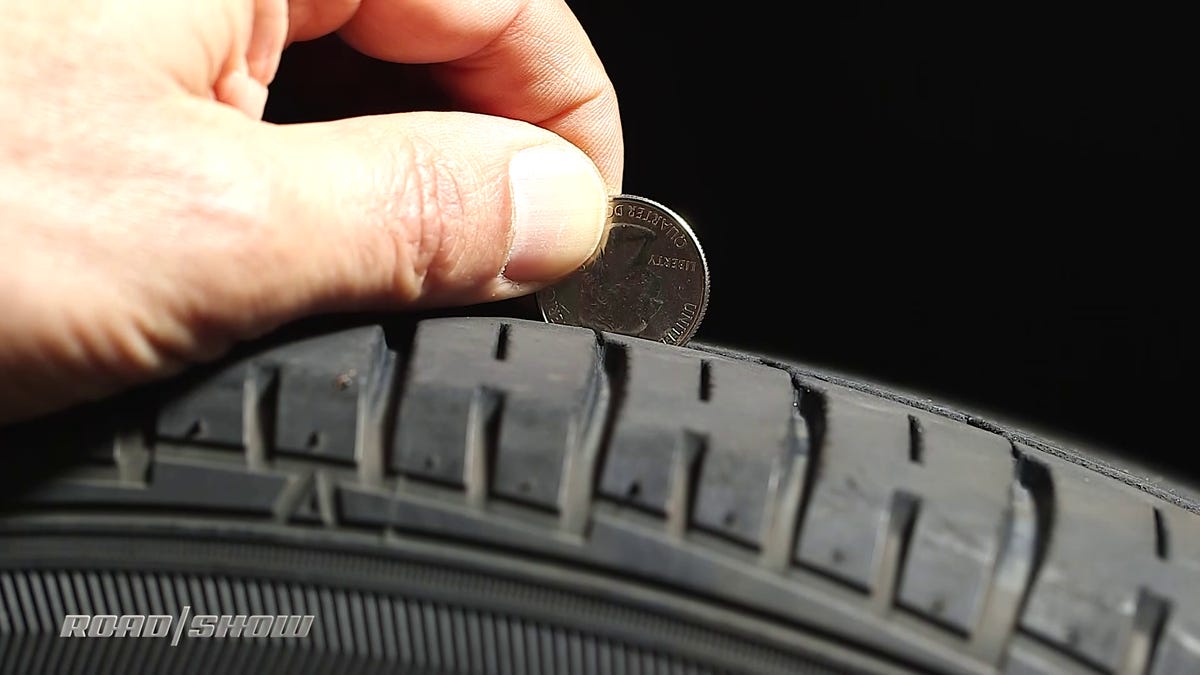 - Tire tread. Shove George Washington into the tread via an upside down quarter. The top of his head should be at least somewhat obscured to indicate that a reasonable amount of tread is left. You can also look at the tire wear bars that run across the face of the tire. If they are flush with the tread, you need new tires.Â