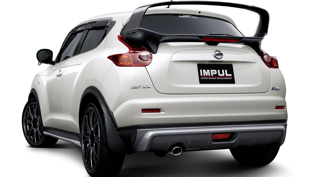 The Impul Juke benefits (or suffers) from a new front bumper with a more aggressive lower lip, side skirts, and a rear diffuser, as well as a restyled grill and a huge, aggressive rear wing. There are also larger wheels in a Hyper Black finish, side-window vent visors, and what look like small winglets hanging from the bottom of the side mirrors. Rounding out the look are Impul script graphics along the vehicle's flanks and Impul badging at both ends.