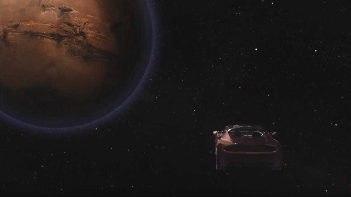 It's probably going to be a few decades yet before people are actually driving on Mars, but that's not stopping Elon Musk from showing the world how two of his companies will work hand-in-hand to get the first car to Mars -- even if it likely will never touch down.
