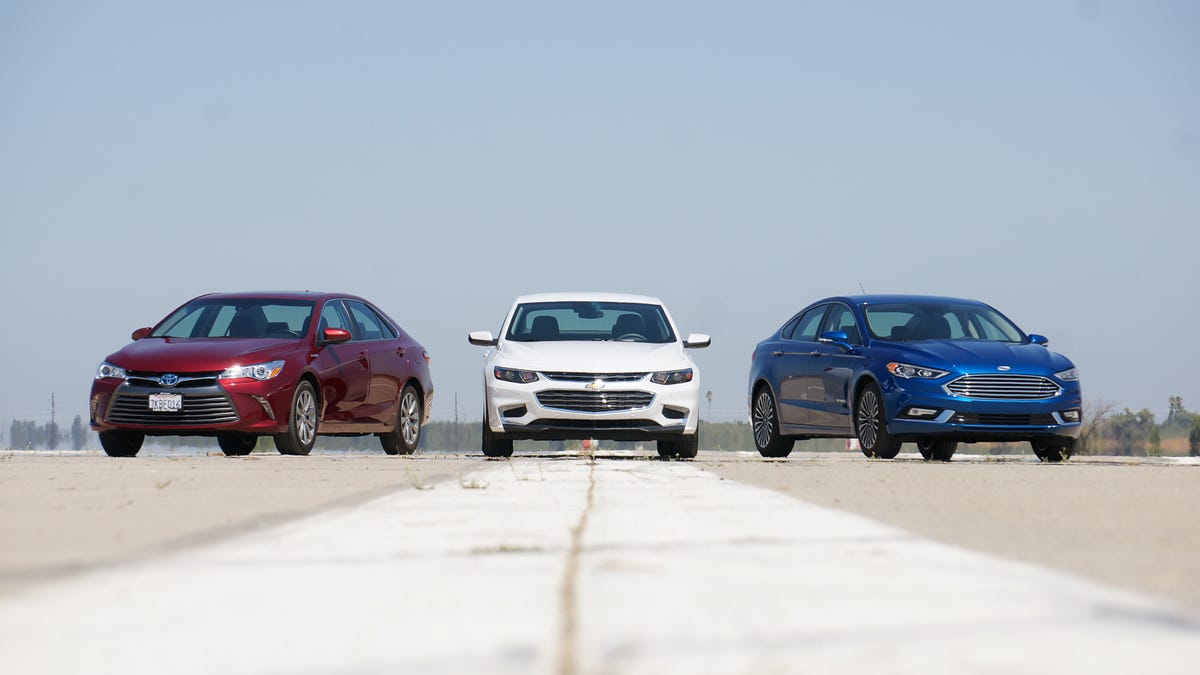 For this turn of Roadshow Rivals, we've taken the hybrid versions of the 2017 Ford Fusion, 2016 Toyota Camry and 2016 Chevrolet Malibu and put them to the test to see which one takes the hybrid podium. We did a fuel economy test on the mean city streets, but we also spiced things up with a drag race at an abandoned air strip.