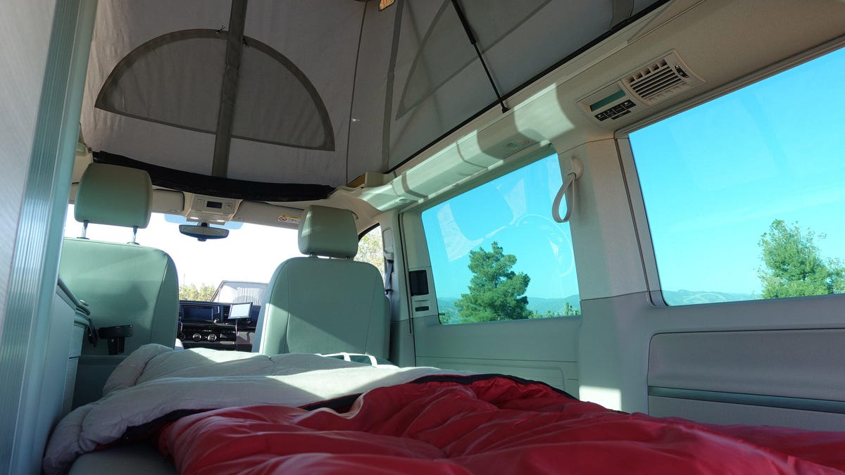 It's not all perfect, of course. Sliding the bench seat forward to make the bed requires a bit of muscle, and the front seats will only swivel around from one very specific position in the fore-aft slider. The sleeping surfaces themselves are also a bit tough. If you're Princess-and-the-Pea sensitive like me, bring an extra cushion.