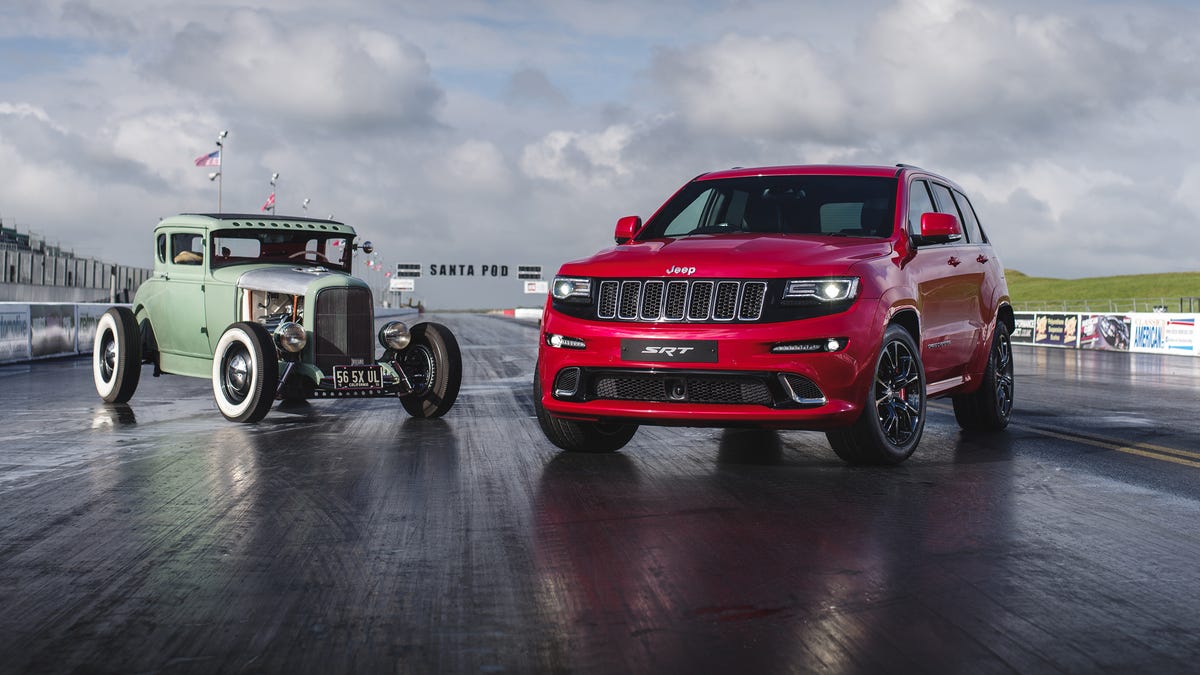 This drag race is courtesy of 's United Kingdom arm. The automaker pitted its Jeep Grand Cherokee SRT (no, not the Trackhawk) against a Hemi-powered hot rod, for no reason I can surmise other than it being a fun way to show off the Grand Cherokee's power. Behind the wheel of the Grand Cherokee is UK drag racing champion Stuart Doignie.