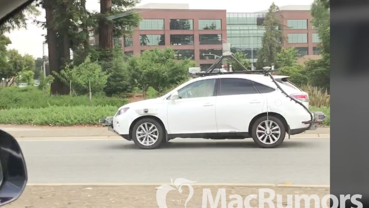 MacRumors posted a reader-submitted video, showing Apple's Lexus RX outfitted with all manner of self-driving hardware, including a Velodyne lidar emitter, multiple radar emitters and a whole bunch of cameras. It was just cruising down CA 101 in Palo Alto, minding its own business.