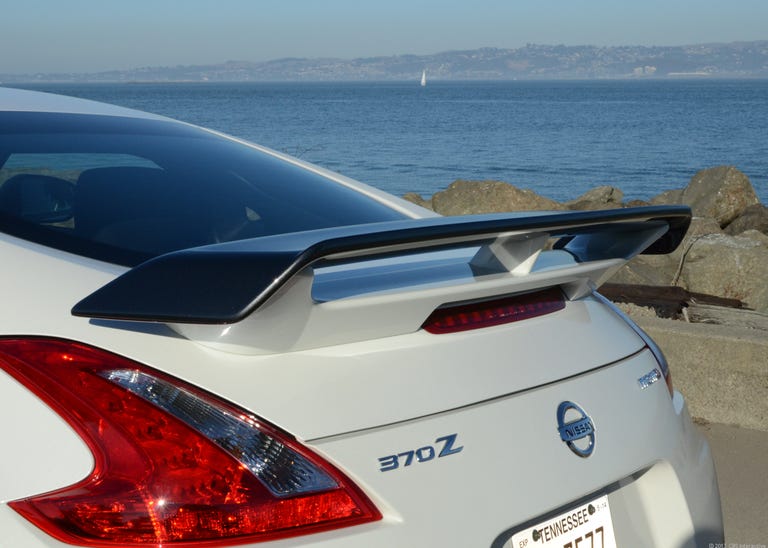 The increased power of the Nismo's tune is certainly welcome, but the standard Z is already plenty fast, and this Nismo Zed doesn't feel noticeably faster in a straight line than a non-Nismo or a Hyundai Genesis Coupe 3.8 R-Spec. This is probably because the Nismo model is also a few pounds heavier (68 of 'em, to be exact) than the standard model thanks to the bulkier aerodynamics, the additional chassis bracing, and that ridiculous spoiler on the rear deck.