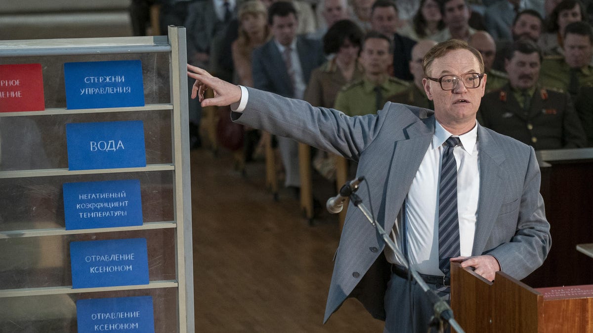 Valery Legasov testifies before the commission, in front of the three power plant officials responsible for the disaster.Â