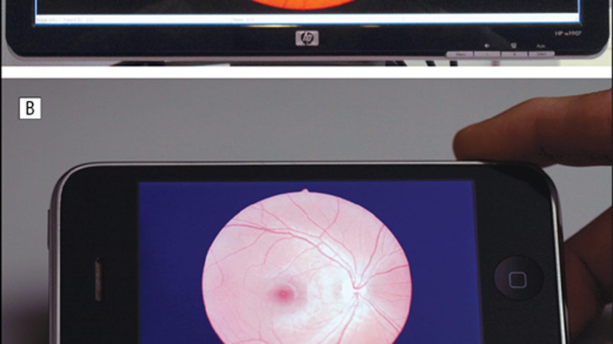 As reported this week in the Archives of Ophthalmology, both doctors rated the iPhone images as good as or better than the desktop ones by a wide margin -- one said 53 were of the same quality, 46 were better on the iPhone, and one was better on the computer, while the other said 56 were equal, 42 better on the iPhone, and 2 better on the computer.