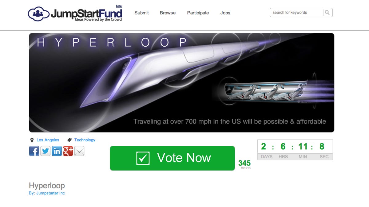 JumpStartFund launched into public beta on August 22, and aims to give entrepreneurs a network through which to both seek funding and support as well as crowdsource the idea and collaborate with others to refine it. The Hyperloop concept, put up on the site by the JumpStart team, became the platform's flagship project within its first week of launch.