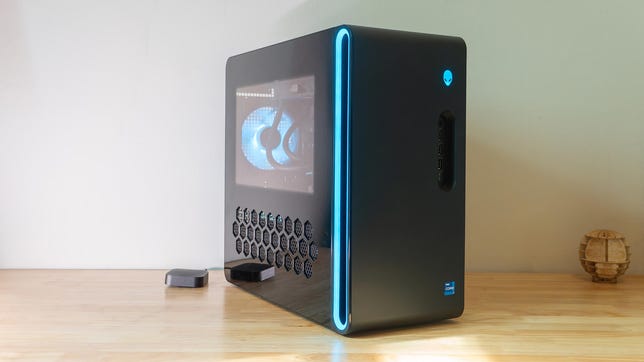 The Alienware Aurora R16 is an interesting-looking machine. It's not quite as out-there as the alien heads of yore, but it features a unique air channel at the front with a ring of RGB lighting that syncs with an exhaust fan in the back. The top of the system and half of the glass side panel both feature a lattice of honeycomb-shaped holes that provide stylish ventilation.Â