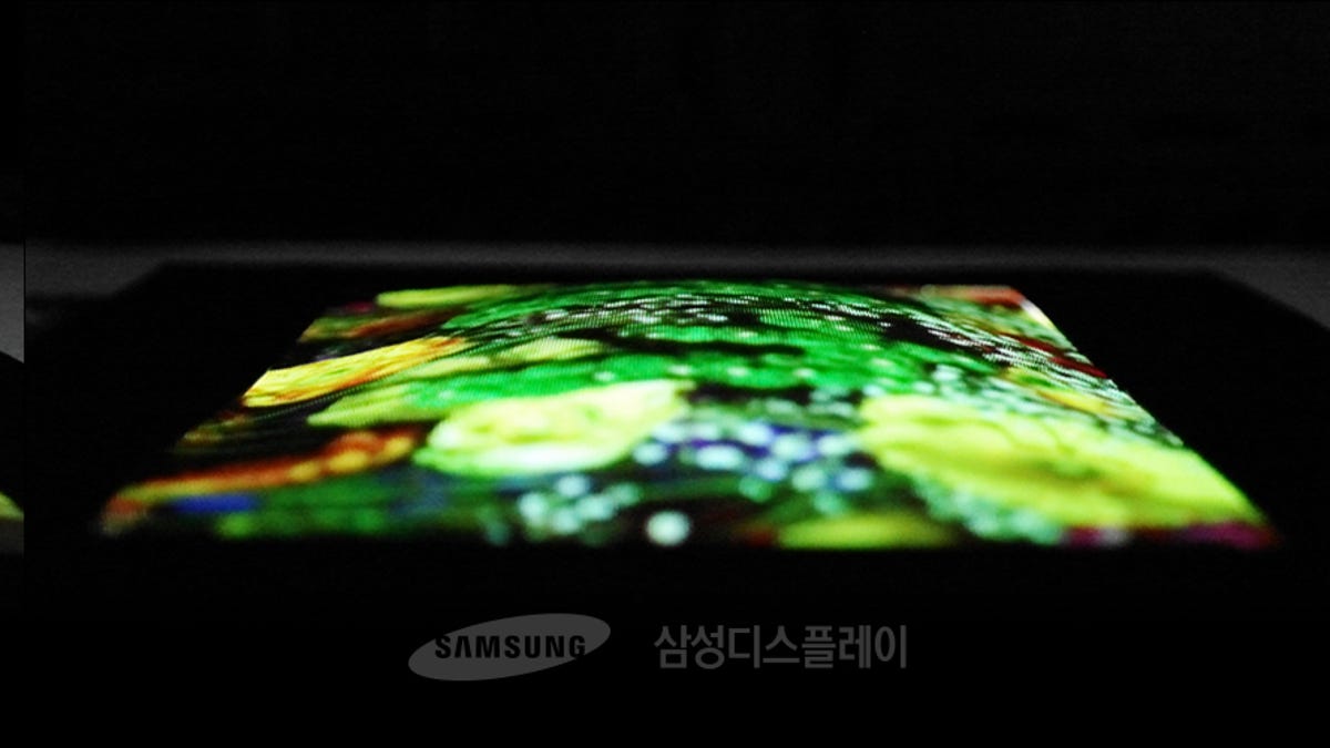 When you press the screen from above, it depresses like a rubber balloon, Samsung said, then bounces back to its original flat shape. "The screen when stretched up or down, even when pressed, has sufficient elasticity to recover," Samsung said.