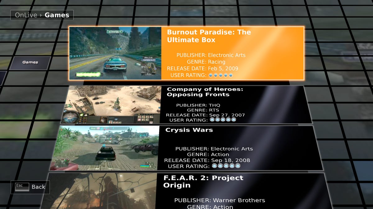 That's obviously an essential feature, as it's hard to imagine anyone paying for a service like OnLive, no matter what games are on offer, if the user experience is inadequate. But the company promises that as long as users have the requisite minimum hardware, operating systems, and Internet connections, they should be able to have seamless play.