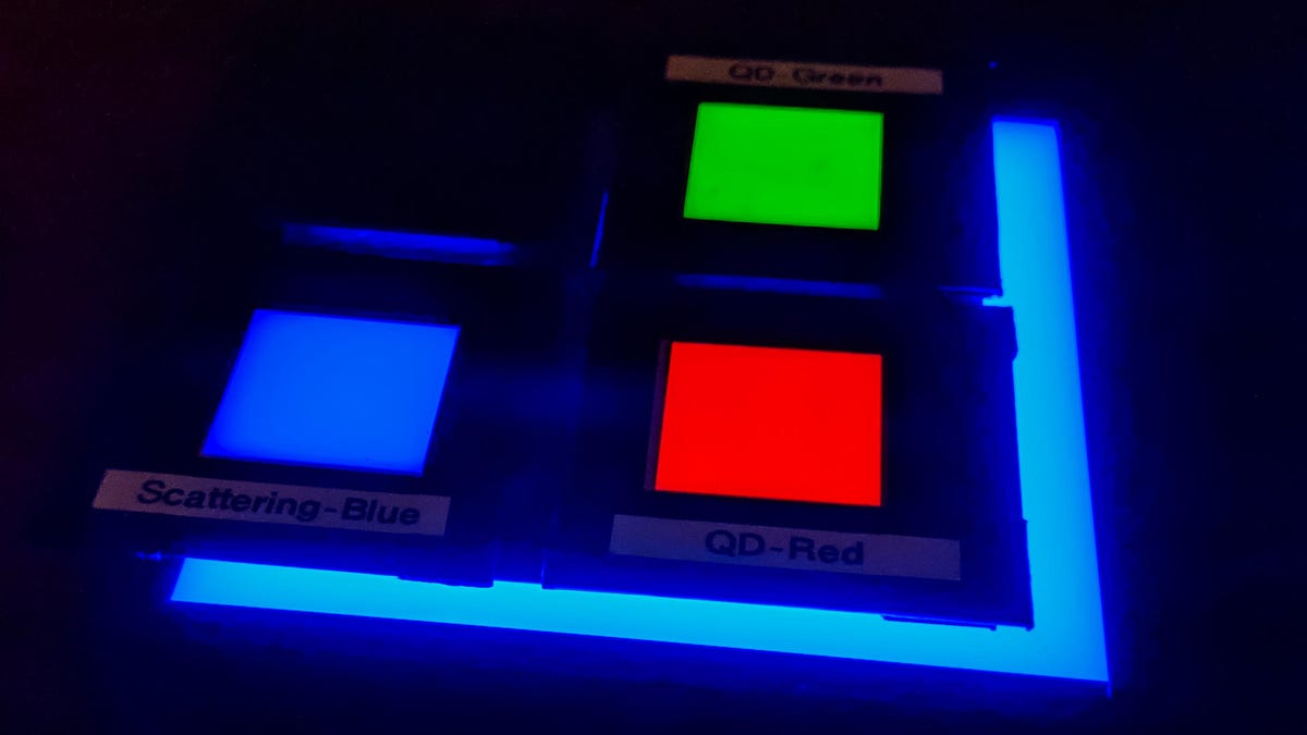 You can see this in practice in the image at the top of this article. A blue LED backlight is causing two squares of red and green quantum dots to glow. Â