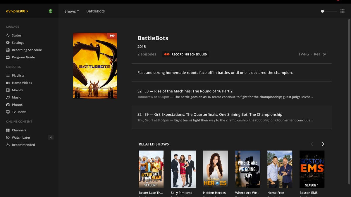 Williams walked me through the feature and it seems well implemented, if more limited than a traditional over-the-air DVR such as TiVo Roamio OTA or the ChannelMaster+. The main appeal is that recorded shows are neatly integrated into Plex alongside other video, photos and music, and available to watch not only on the main TV, but on other TVs in the house as well as mobile devices. In that way Plex's DVR is much like Tablo, or HDHomeRun's own software.