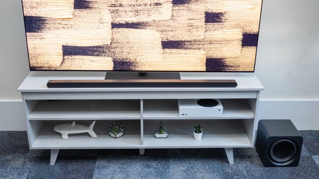 The soundbar itself is 45 inches long by roughly 1.5 inches high and wide, while the subwoofer is also diminutive at 9.3 inches all around. The soundbar boasts nine drivers in its tiny frame -- two stereo racetrack drivers with tweeters, a center incorporating two more racetracks and a tweeter and two Atmos overheads. Meanwhile, the subwoofer includes a 6.5-inch driver and a passive woofer.