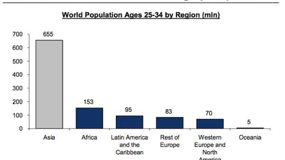 The analysis, presented in a note to investors, suggests that only 22 percent of Asian carriers are selling Apple's iPhone. Asian carriers represent nearly 10 percent of world's highest smartphone penetration demographic (25- to 34-year-olds), about 655 million people. Africa represents the second highest amount at 153 million people.