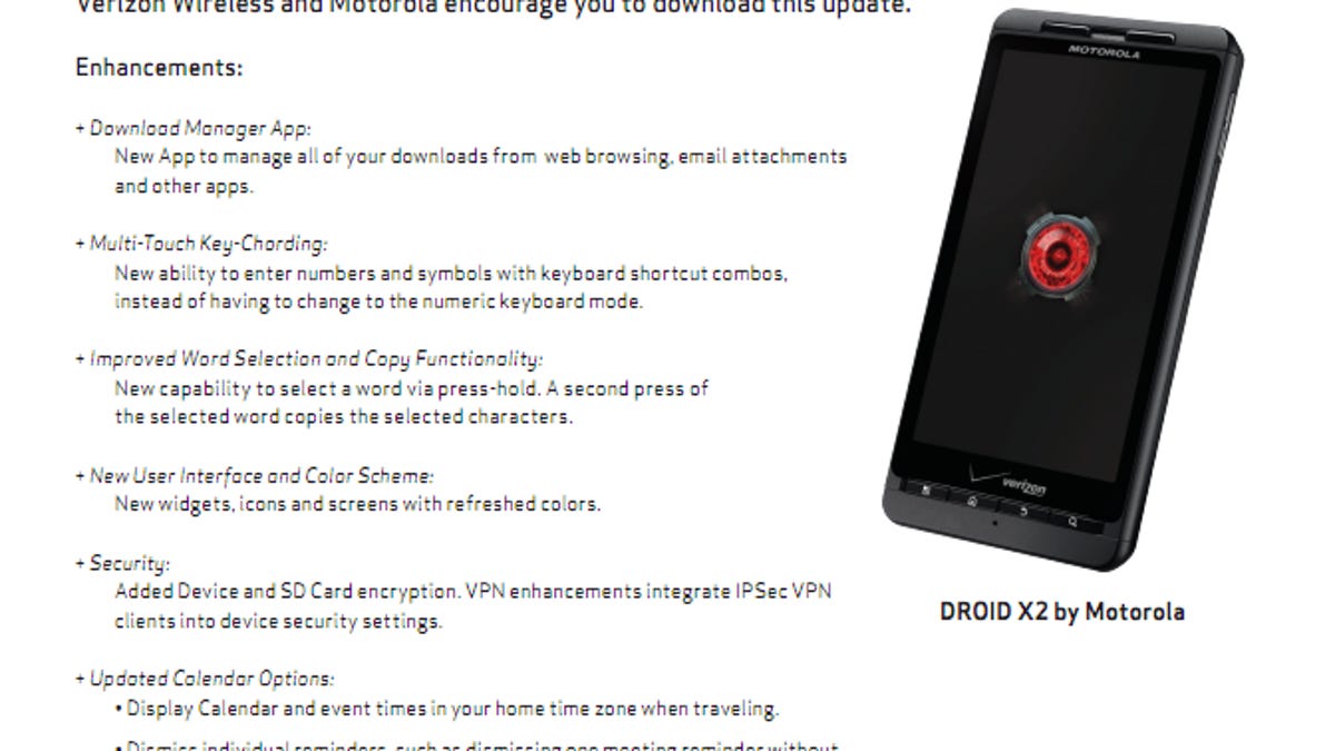 Verizon Wireless's Android lineup grew a little stronger today when the carrier began deploying 2.3 Gingerbread to the Motorola Droid X2. The 101MB software update features a number of bug fixes and general enhancements plus improvements to existing applications. As is the case with nearly all recent Verizon updates, the addition of a new Download Manager app provides a central place to handle downloads.