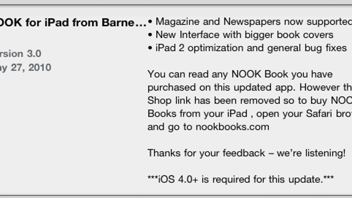 After removing its Nook app for iPad from Apple's App Store for a few days, Barnes & Noble's now has a new, updated iPad app available for download. The new app complies with Apple's new in-app subscription rules and has no links to Barnes & Noble's e-book store or Web site.