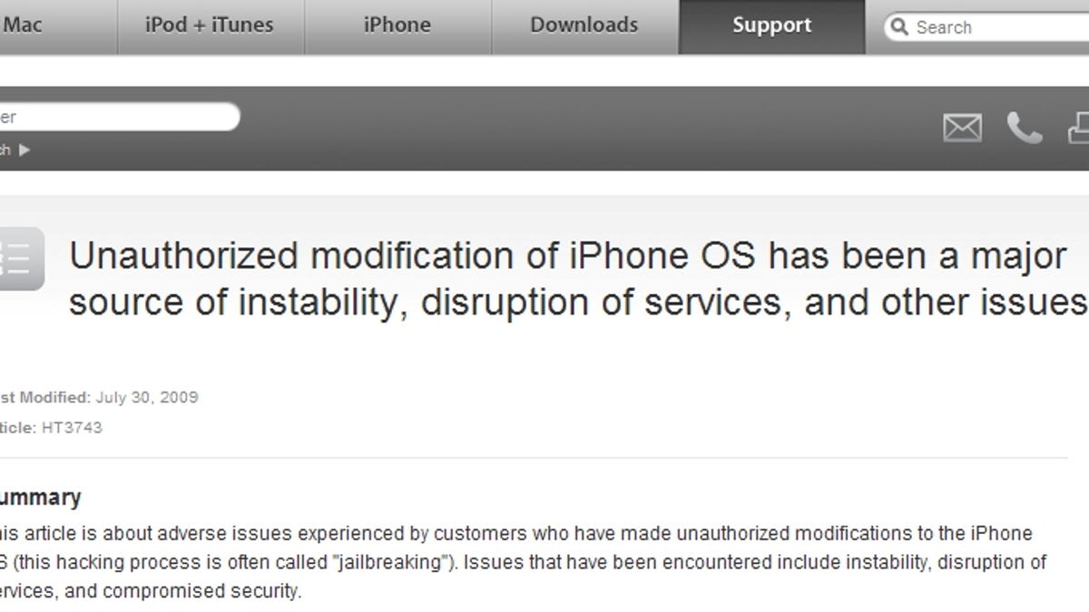 Apple published Thursday a support article cautioning users about jailbreaking the iPhone (as well as other Apple handheld audio devices).