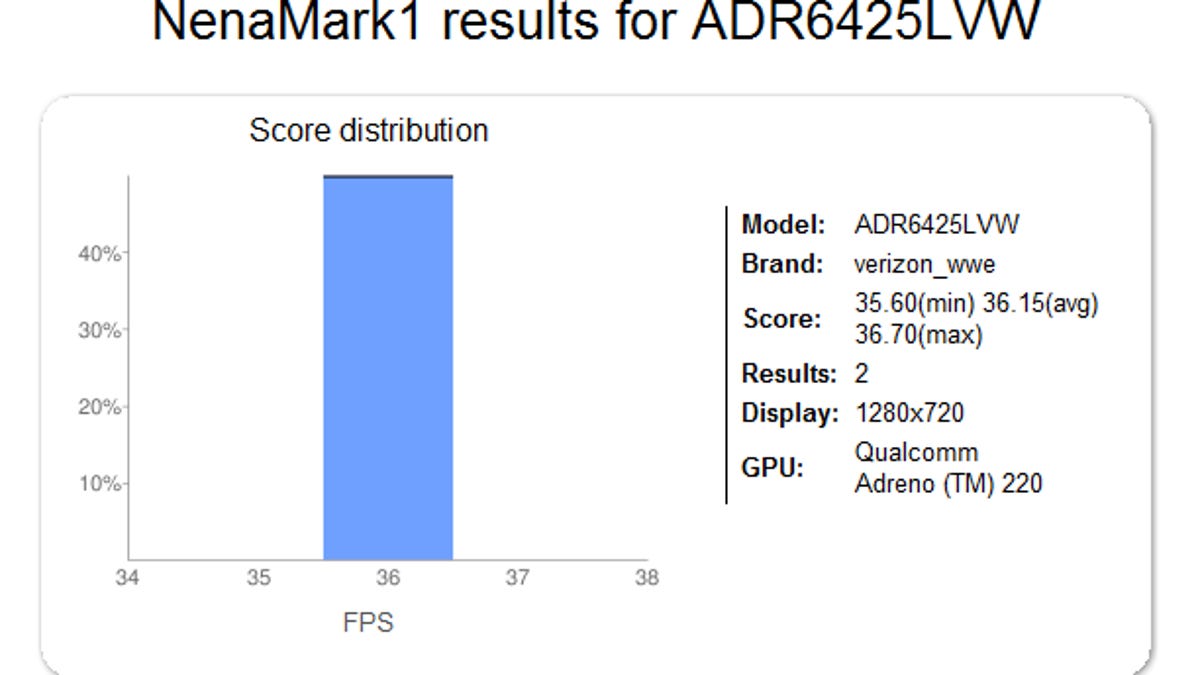 According to the NenaMark benchmark scores, the HTC ADR6425LVW, or Vigor, should offer not only a a 1,280x720-pixel-resolution display, but also a 1.5GHz processor with a Qualcomm Adreno GPU and Android 2.3.4 Gingerbread. It's not immediately obvious whether the device has a dual-core platform, but that seems logical given that today's top phones offer dual-core 1.2GHz processors.