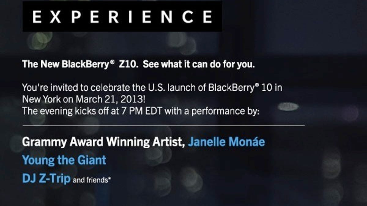 BlackBerry issued invitations this morning for a March 21 event in New York to launch its new Z10 smartphone and BlackBerry 10 OS.