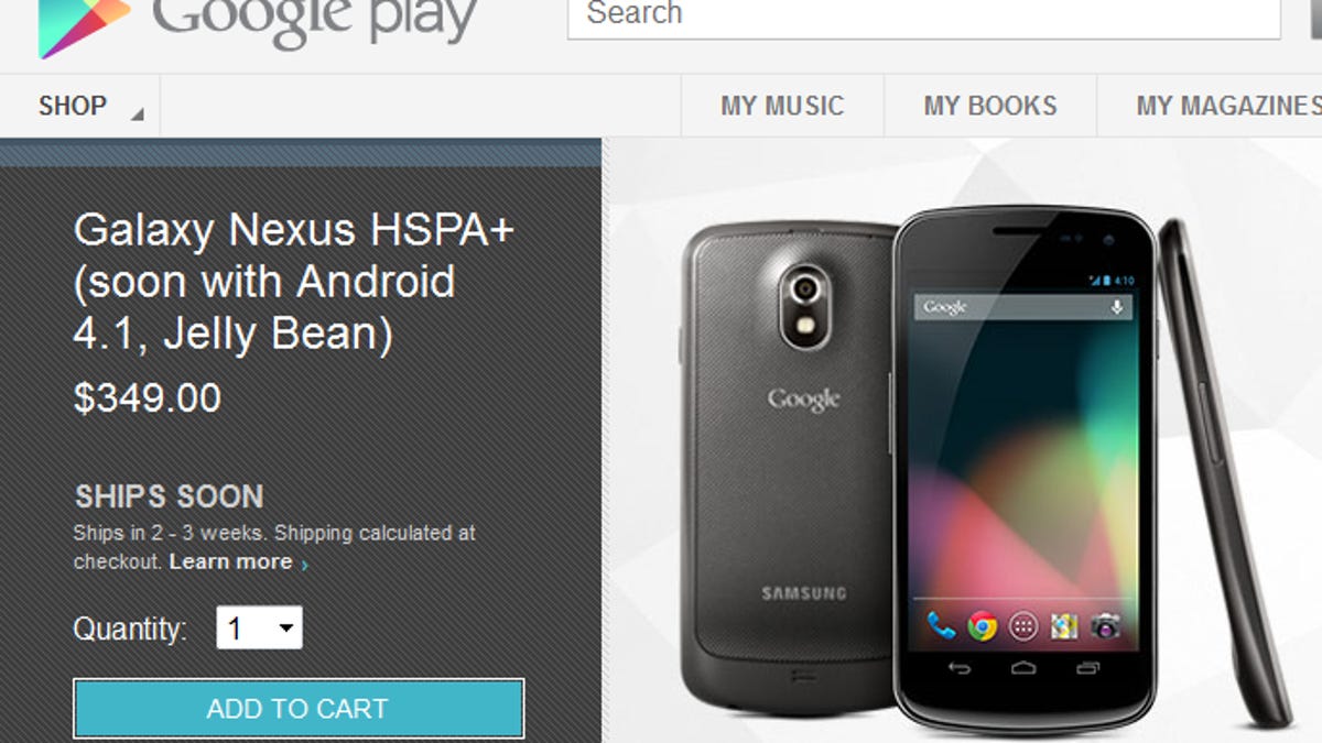 The Google Play listing says the Galaxy Nexus will have Jelly Bean "soon." So it may be the temporary lifting of the ban that's responsible for the smartphone's reappearance in the store. In any case, the listing says the phone won't ship for two to three weeks, by which time it may have Jelly Bean installed.