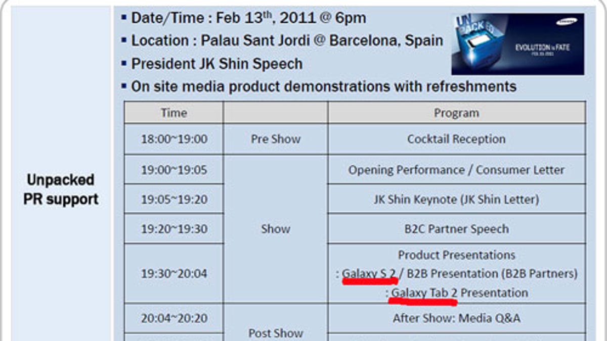 The sheet, which has since been pulled offline, detailed PR planning for the company's Unpacked event. It looks like Samsung expects to debut the Galaxy S 2 and Galaxy Tab 2 on February 13. Being that this is as close as we have come to any actual confirmation of the devices, we don't know know what the hardware and software will look like. Officially, that is.