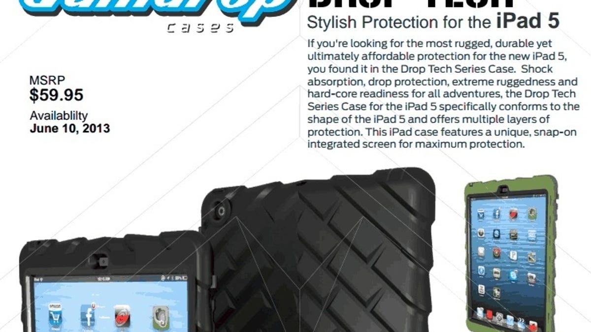 Hickman wouldn't say who his sources are, but he's confident enough in them to start producing new cases for the iPad 5 and put them up for preorder. In fact, a press sample of the $59.99 Gumdrop Drop Tech is due to arrive later today, and we'll update the post with new pictures once we get it. Gumdrop is also manufacturing the Gumdrop Bounce ($34.95) and Gumdrop Drop Tech Designer Series ($59.99). They're scheduled to ship on June 10. (It's worth noting that sometimes cases built on leaked specs don't fit absolutely perfectly, but presumably Gumdrop will allow customers to return cases if they don't fit perfectly.)