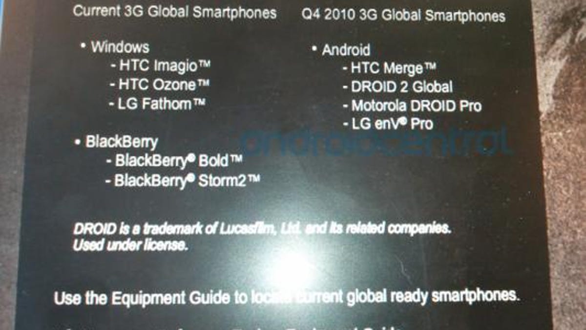 Rumors of a Droid 2 Global phone have been swirling for a few months now, but neither Motorola nor Verizon have made any official announcements. Motorola's Web site last week accidentally listed a few specifications, including a 1.2GHz processor, a sliding QWERTY, and 5-megapixel camera. Unfortunately, the handset maker quickly realized the error and pulled the information.
