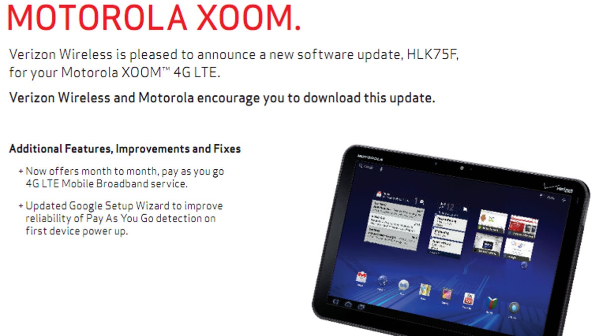 Xoom owners will receive a notification when the HLK75F update is ready for download in the coming days. The file update is 7.8MB in size and takes approximately 5 to 10 minutes to download and install, according to Verizon.