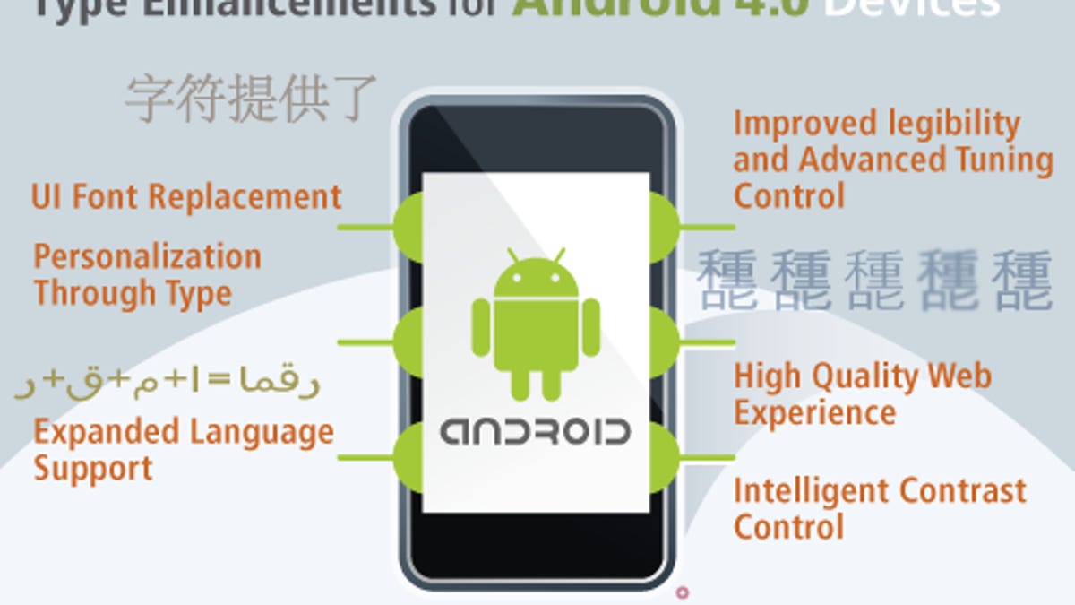 Monotype Imaging today announced a new mobile font suite designed for Android Ice Cream Sandwich devices. The suite, which offers a slew of tools and services for developers and manufacturers, is called "Type Enhancements for Android."