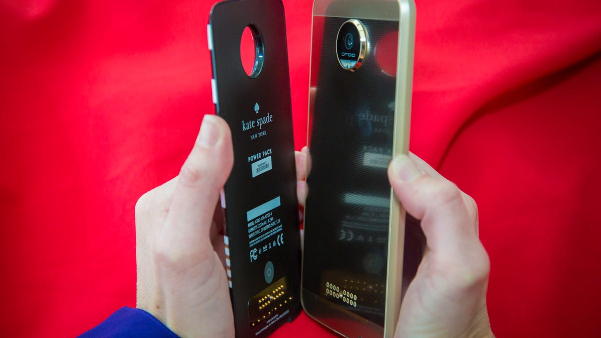 These backings are called Moto Mods and they connect to the phones using 16 magnetic pins located on the back. The magnets are water resistant, and when I snapped the backings together they felt strong and secure. The accessories will inevitably add more bulk and weight to the overall device, but the handsets are quite thin to begin with.