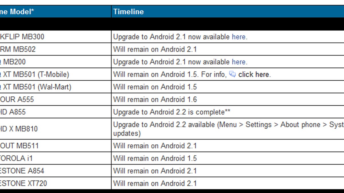 Of course, that means that the smartphones, which were released with Android 2.1 back in the fall, will remain on Eclair indefinitely. The handsets join a growing list of Motorola phones being left behind on older versions of Android. Most recently, the company decided that the Cliq XT would stay on Android 1.5 and never see features such as Google Maps Navigation or live wallpapers.