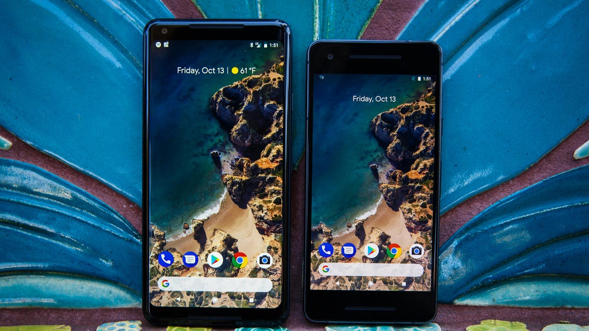 The Pixel 2 vs. the Pixel 2 XL. The smaller phone uses a 5-inch Samsung AMOLED screen, while the larger has a 6-inch LG P-OLED one.