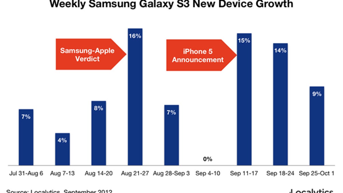 Since August 1, sales of the S3 have seen average weekly growth of 9 percent, following by big spikes after the Apple lawsuit verdict and the iPhone 5 announcement, according to mobile-app analytics firm Localytics.