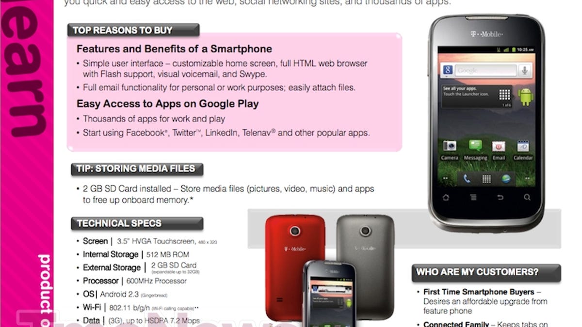 The leaked information indicates that the smartphone will initially be available in Best Buy on May 6, expanding to Wal-Mart later in the week. Pricing for the handset has yet to surface, but I'd hope to see $50 or less with contract.