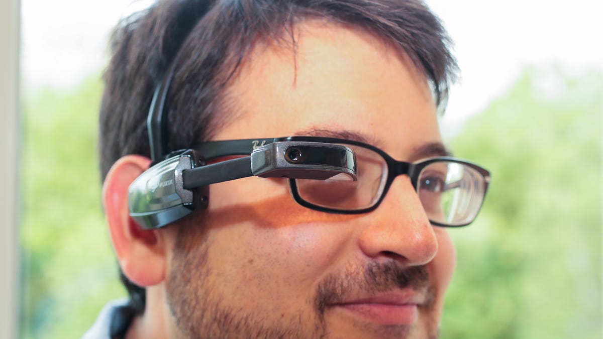 The M100's projected image isn't much different in feel from Google's, but the headband can be flipped so that the eyepiece is on either eye -- a nice touch. Trying it on, however, I found that this admittedly early unit felt a little floppy, and the opaque eyepiece seemed to lower directly over my eye versus hovering above it like Glass. Then again, I may have been using it wrong.