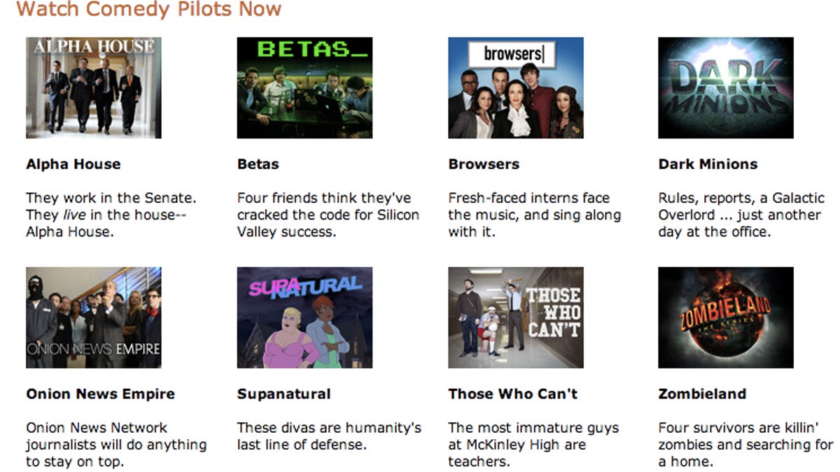 The lineup includes a big slate of comedies, led by "Alpha House," starring John Goodman with cameos by Bill Murray and Stephen Colbert and "Onion News Empire," with Jeffrey Tambor, as well as a musical "Browsers" starring Bebe Neuwirth. "Big Bang Theory" co-stars Kevin Sussman and John Ross Bowie are behind a comedy, "Dark Minions," and Ed Begley Jr. and Jon Daly star in "Betas," which has some Silicon Valley flavor. In addition, the pilots include an animated comedy, "Supanatural"; "Zombieland," based on the hit movie; and "Those Who Can't," which was submitted and developed by team online with no previous Hollywood experience.