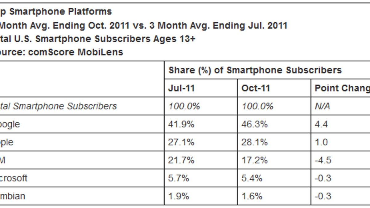 In third place was BlackBerry maker RIM with 17.2 percent of the market, a loss of 4.5 points from the prior three months. That left Microsoft's Windows Phone with 5.4 percent and Nokia's Symbian with 1.6 percent, both losing a small fraction of a percentage point.