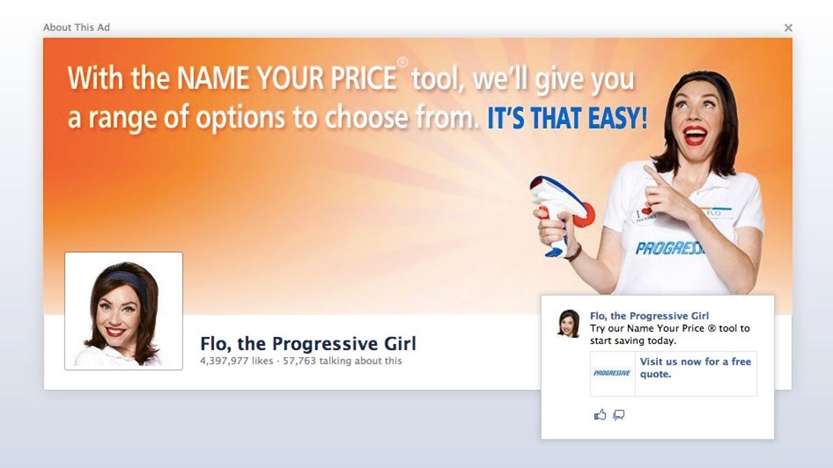A social ad? Sort of, I guess. It wants me to "like" it to get an insurance quote. But make no mistake: While Facebook can come up with whatever terminology it wants, this is the sort of ad that Mark Zuckerberg has long shunned -- the kind that splashes across the page the way one would expect to see on Yahoo, not Facebook.