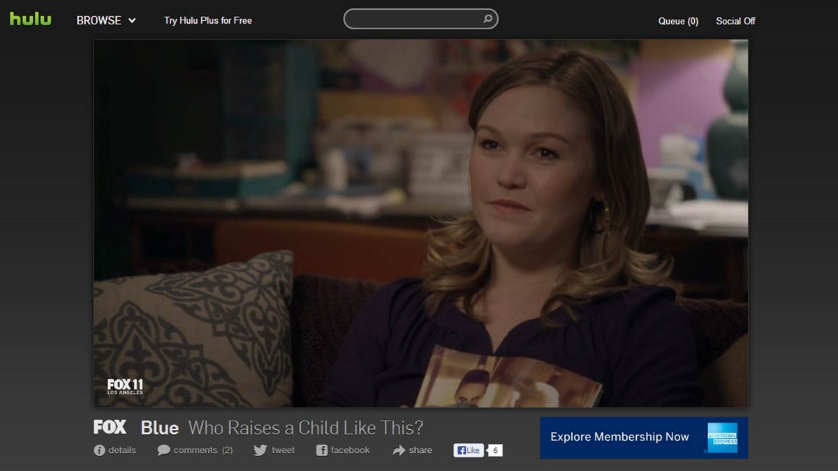 Ad-supported Hulu and subscription service Hulu Plus now have the first two seasons of "Blue" available. The show, which stars Julia Stiles as a mom who is also an upscale escort, is in a longer, TV-like format on Hulu, with three or so of the shorter YouTube-size segments edited together into full-length dramas.