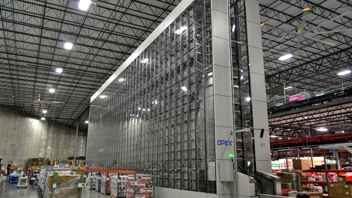 One of the first things to greet you at the Boxed warehouse floor in Union, New Jersey, is a four-story-tall gray robot employees call the Opex.Â