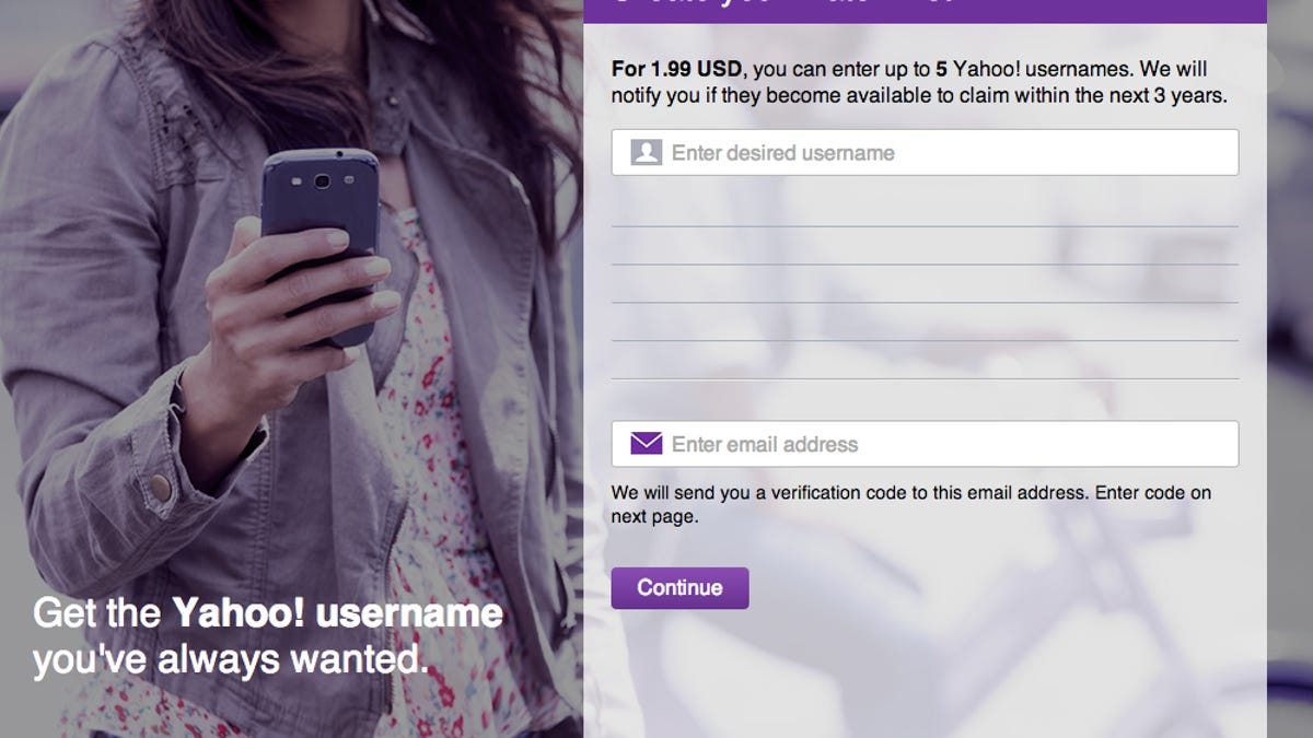 Having gone through the names and determined which were up for grabs, Yahoo said in a blog post that it would be notifying users who made requests that match a newly free username Monday. If none of the five turned out to be available, that user is being added to a new Watchlist feature that will keep tabs on desired nicknames for three years. Those who already picked their top five are being moved to Watchlist for free, but signing up for Watchlist now will cost latecomers $1.99.