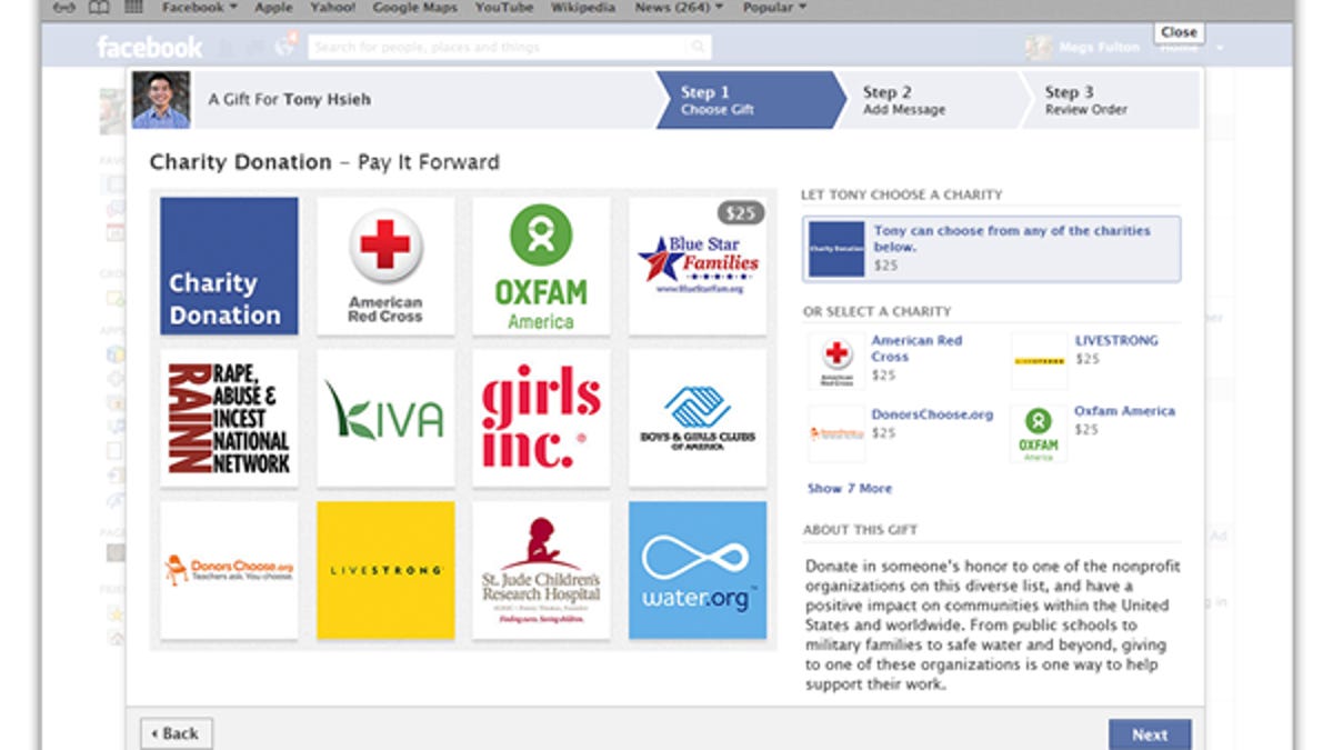 As part of the social network's Facebook Gifts service, users can now send donations in a friend's name to organizations like the Red Cross, the Boys & Girls Clubs of America, or DonorsChoose.org.