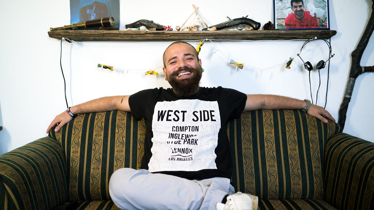 YouTube star Firas Alshater (second from right) met with CNET reporters (from left) Andrew Hoyle, Katie Collins and Shara Tibken in the Berlin office where he films his videos.