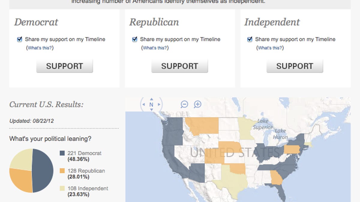 As of this writing, 1,660 people on Facebook have pledged to vote in November. Of the participating users, 53 percent said they are Democrat, while 25 percent are Republican, and 22 percent said they are Independent. The economy has the most votes as being the most critical issue for users.