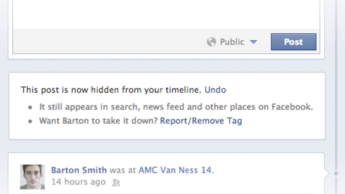 • Facebook adds tutorial messages for privacy actions (See image at the top of this post). For example, when a user hides a post from a Timeline, a message will pop up that explains that while the post is hidden on the Timeline, it will still show in in other places, like your friends' news feeds and in searches. Similarly, if you untag yourself from a photo, the prompt would tell you that your photo will still be in the album you were tagged in and the only way to remove the photo completely is ask your friend to take it down. Eventually these "in-product education" notices will also extend to the "View As" feature and others in coming weeks.