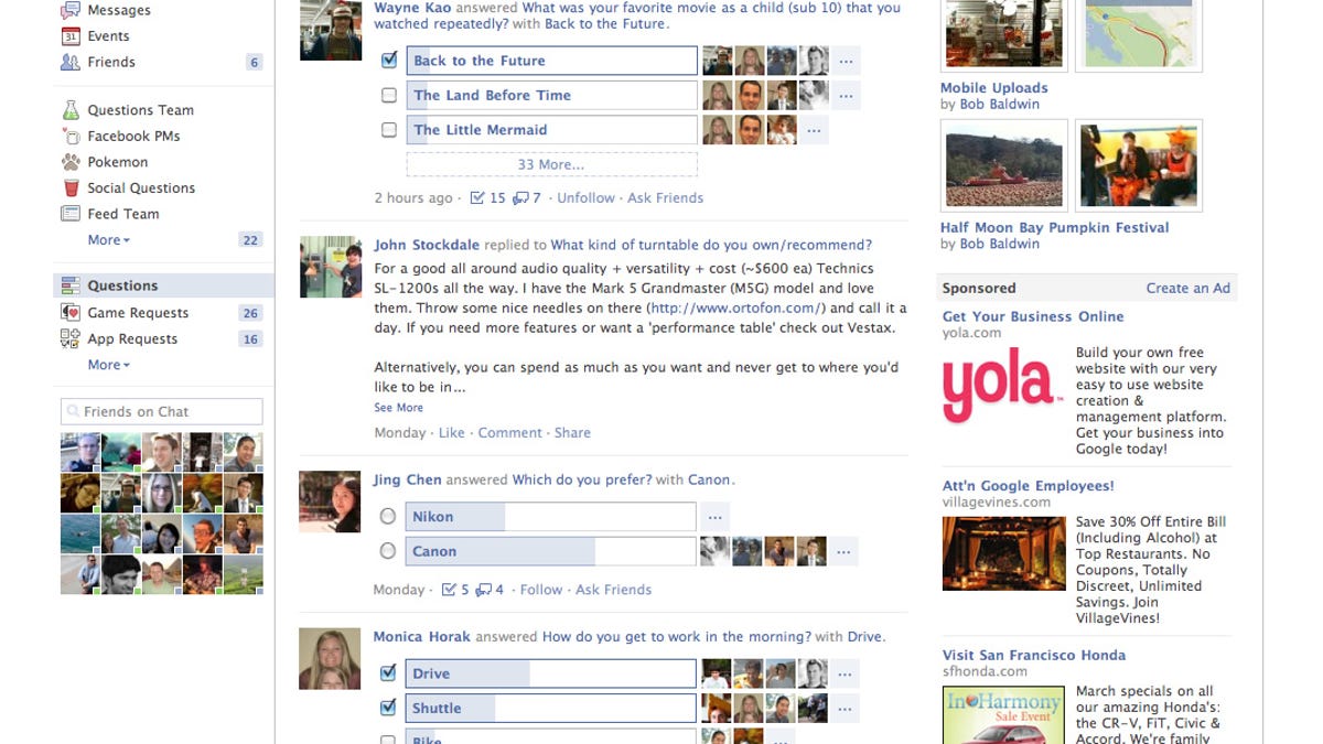 Facebook launched Questionsa couple of years ago, seeking to allow its users to find answers to inquiries by sourcing their friends and the Facebook community at large. The service didn't really take off, and Facebook instead has turned its attention to other areas.Search, in particular, has been a pretty hot topic for the company in the past few months. Chief Executive Mark Zuckerberg has said that Facebook is "pretty uniquely positioned to answer a lot of questions people have." It's sort of "friend mining" -- as CNET pointed out last month -- extracting specific answers to a question by mining the immensely data-rich social graph.