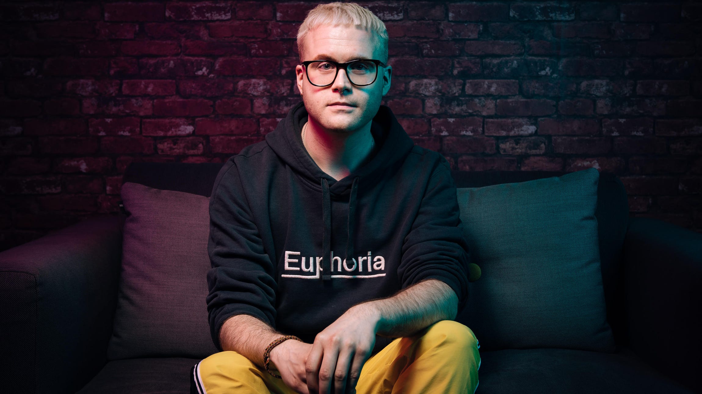 When we met in June at Serata Hall, a cavernous bar and restaurant in the Shoreditch district of East London, Wylie's hair had reverted from the vibrant pink he wore when he first shot into the spotlight, and the green it later became, to its natural white blond with hipster micro bangs. His signature nose ring was still in place. Though Canadian, he pre-vetted the place with a very British brand of self-aware sarcasm, deeming it "sufficiently millennial" for his tastes.
