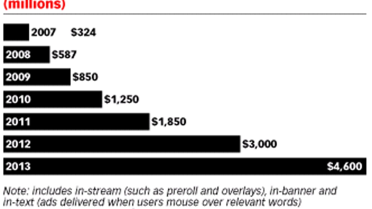 An eMarketer study released Tuesday forecast more growth in years to come: $1.25 billion in 2010, $1.85 billion in 2011, $3.0 billion in 2012, and $4.6 billion in 2013. That's good news for sites such as YouTube that are trying to build an online ad market around video, though the size of the market is still dwarfed by other types of ads.