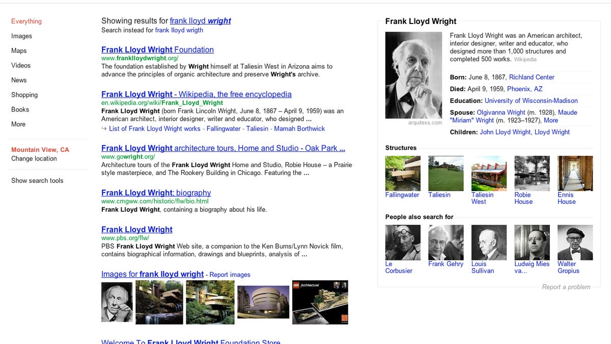 You'll be able to meander through lists of facts and connections when you are searching for items that are in the Knowledge Graph. As one Google example illustrates, if you search for Frank Lloyd Wright, you'll get a fact box with a summary about him (from Wikipedia), a small collection of biographical facts, and picture links to the buildings he designed. If you click on Fallingwater, you'll get another fact box about that house.