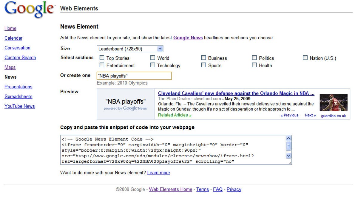 Web publishers have been able to add such feeds to their sites in the past using Google's APIs, said DeWitt Clinton, technical manager of Google's developer relations team. But using Web Elements is a much easier process; if a Web site publisher wants a customized Google News feed, say, they just select the type of feed, type in custom categories, and cut and paste the resulting code into their Web page code.